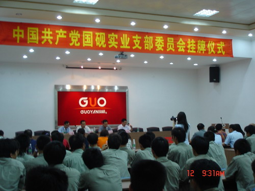 儀式由街黨工委副書記趙思能同志主持,街道辦事處主任周國棟、公司董事長總經(jīng)理王聲位分別在掛牌揭幕儀式上作了熱情洋溢的講活,并為國硯實業(yè)有限公司黨支部正式掛牌揭幕。