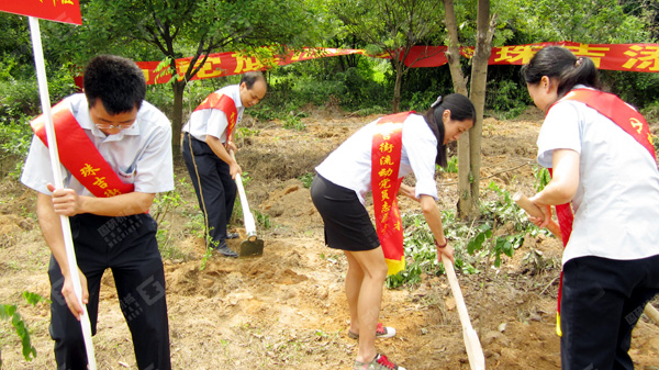 簡單的啟動儀式之后,大家高舉黨旗,直奔植樹活動現場。各位黨員、入黨積極分子不顧炎熱,二人或三人一組,互相配合協作,有的揮鍬填土、有的扶苗加固、有的提水澆灌,現場一派熱火朝天的景象。在大家的共同努力下,二百多棵樹苗很快栽植完畢,原本毫無生機的荒地轉眼已是綠意盎然。一場及時雨之后,小樹苗更是棵棵充滿生命的活力。